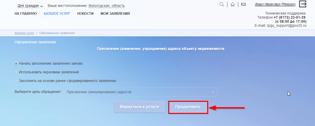 Вы можете создать новое заявление или использовать имеющиеся черновики. Далее нажмите кнопку Продолжить