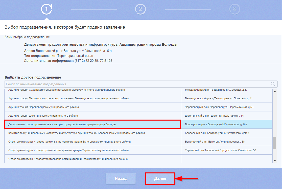 Выберите подразделение, в которое будет подано Ваше заявление, нажав на поле с нужным вариантом в списке. Выбранное Вами подразделение появится над списком подразделений. Затем нажмите кнопку Далее