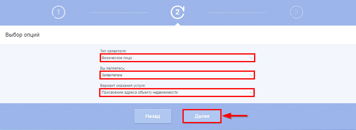Далее выберите нужные варианты в выпадающих списках для полей: «Тип заявителя», «Вы являетесь»,Вариант оказания услуги
