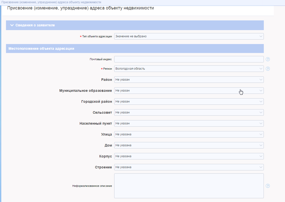 После нажатия кнопки «Далее» откроется форма для заполнения разделов данных: «Сведения о заявителе», «Местоположение объекта адресации», «Предоставляемые документы».