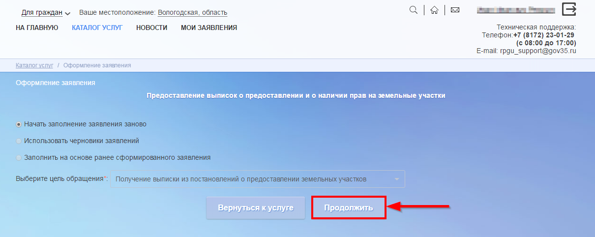 Вы можете создать новое заявление или использовать имеющиеся черновики. Далее нажмите кнопку Продолжить