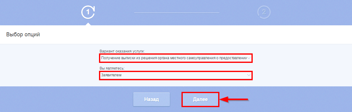 Далее выберите нужные варианты в выпадающих списках для полей: «Вариант оказания услуги», «Вы являетесь». Затем нажмите кнопку «Далее».