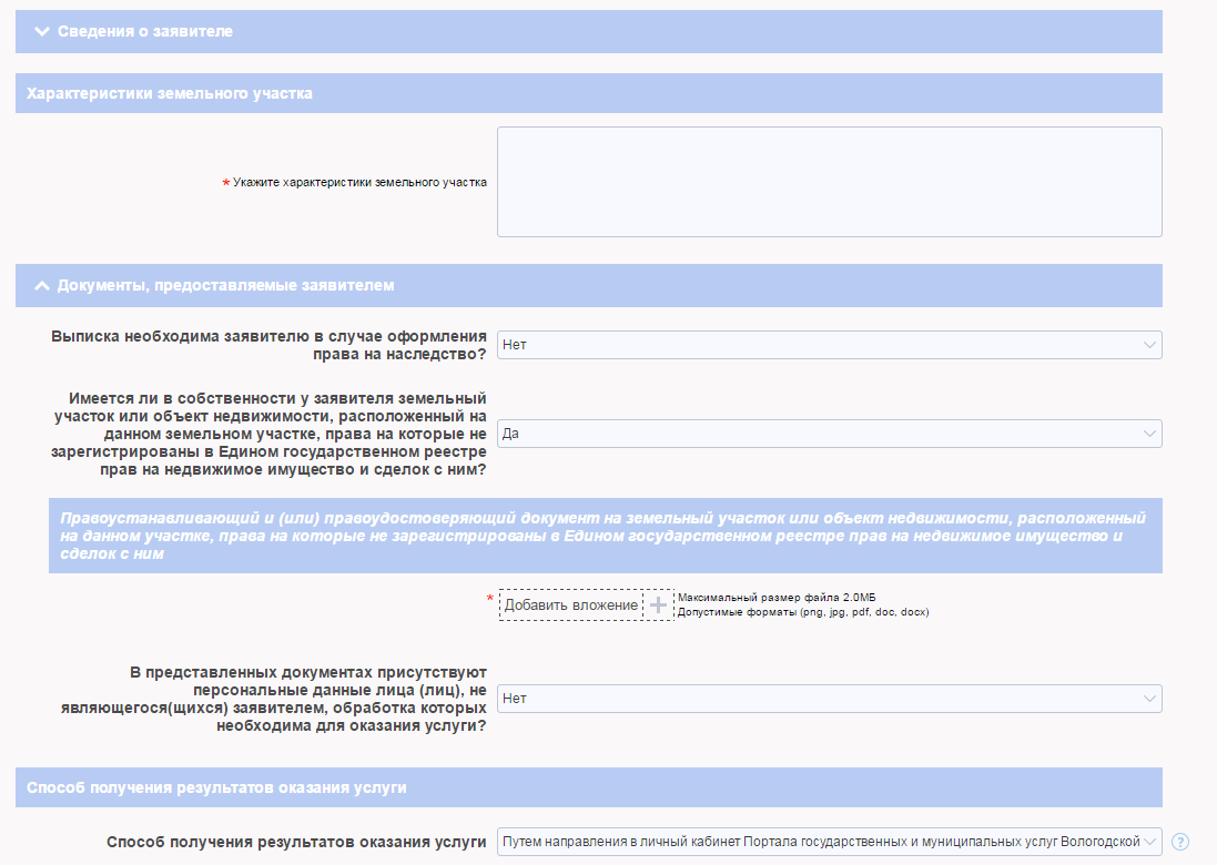 После нажатия кнопки «Далее» откроется форма для заполнения разделов данных: «Сведения о заявителе», «Характеристики земельного участка», «Документы, предоставляемые заявителем».