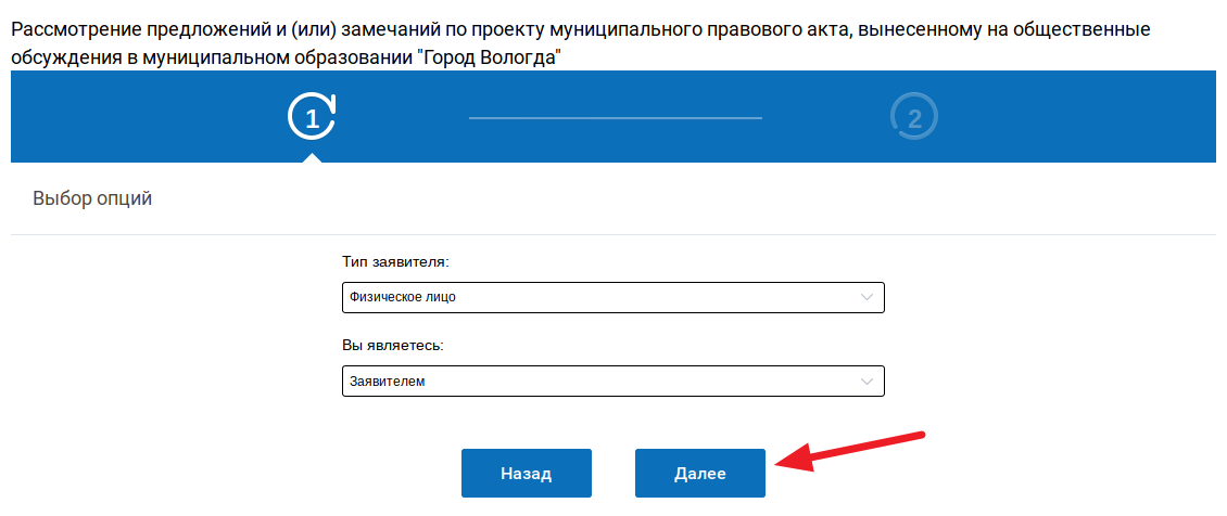 Затем выберите нужные вариант в выпадающем списке для полей: Тип заявителя