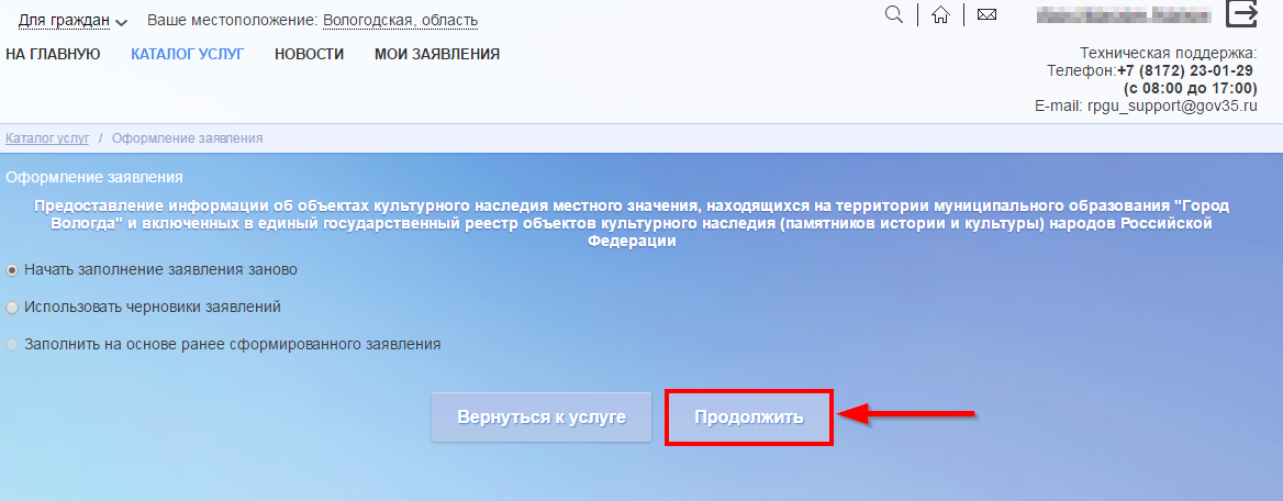 Вы можете создать новое заявление или использовать имеющиеся черновики. Далее нажмите кнопку Продолжить