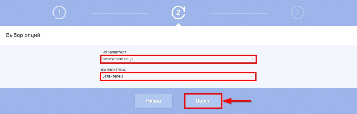 Далее выберите нужные варианты в выпадающих списках для полей:Тип заявителя: