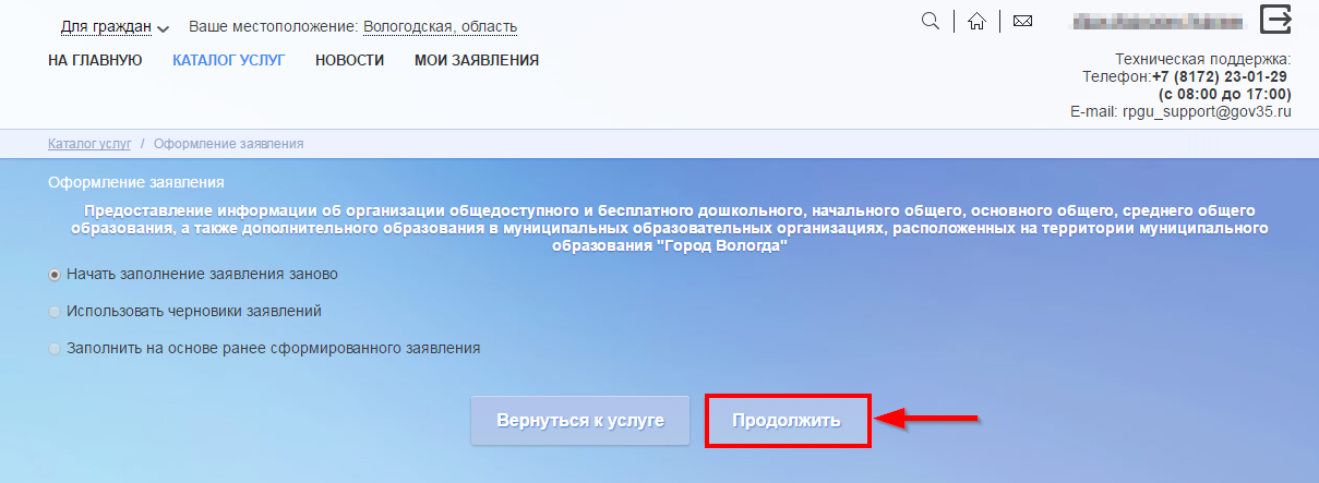 Вы можете создать новое заявление или использовать имеющиеся черновики. Далее нажмите кнопку Продолжить