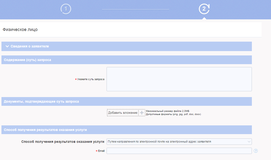 После нажатия кнопки «Далее» откроется форма для заполнения разделов данных: «Сведения о заявителе», Содержание (суть) запроса