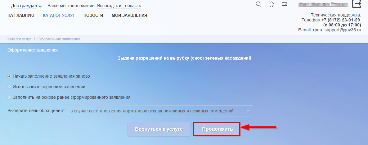 Вы можете создать новое заявление или использовать имеющиеся черновики. Далее нажмите кнопку Продолжить