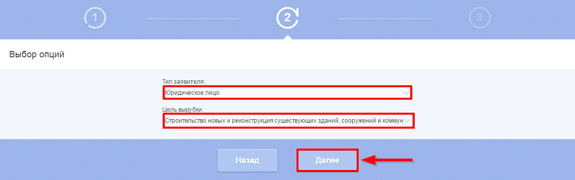 Далее выберите нужные варианты в выпадающих списках для полей: Тип заявителя