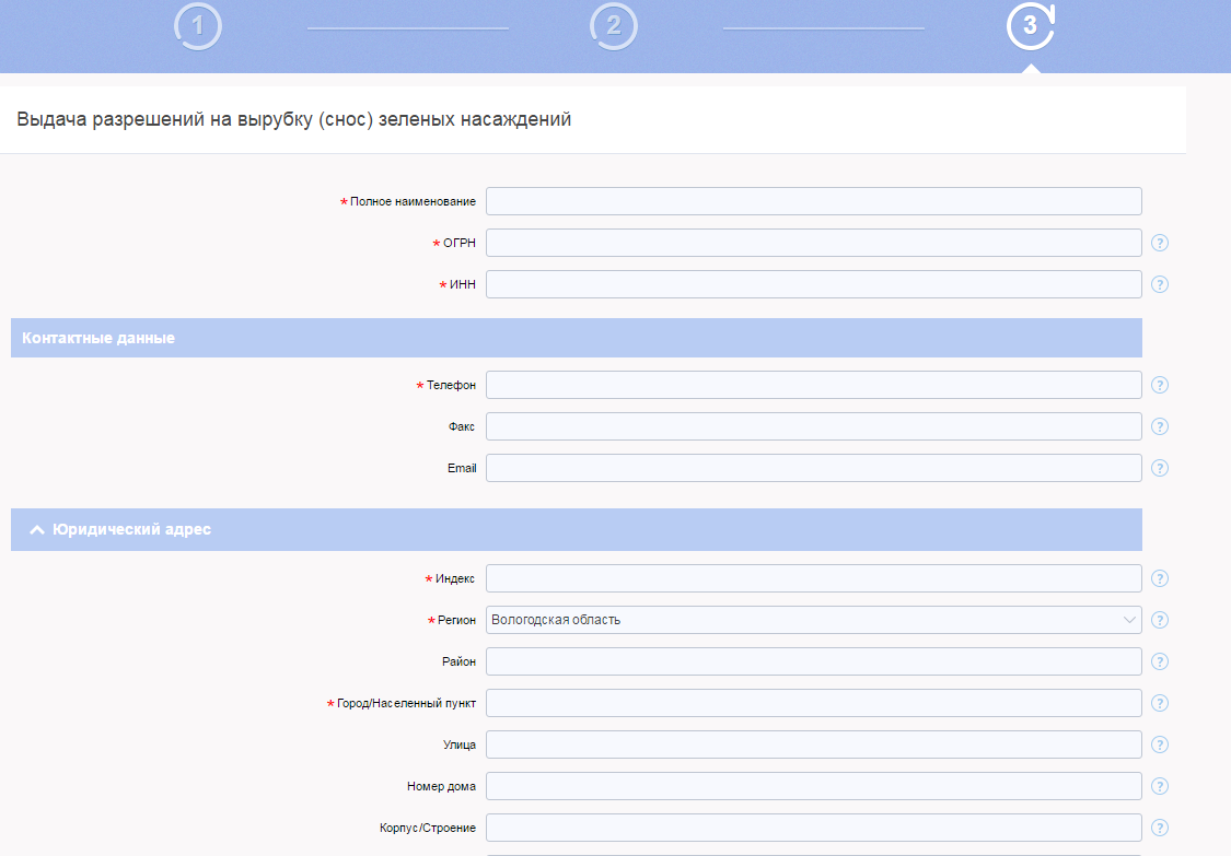 После нажатия кнопки «Далее» откроется форма для заполнения разделов данных: «Сведения о заявителе», Контактные данные