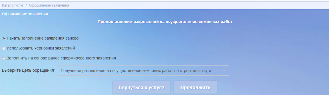Вы можете создать новое заявление или использовать имеющиеся черновики. Далее нажмите кнопку Продолжить