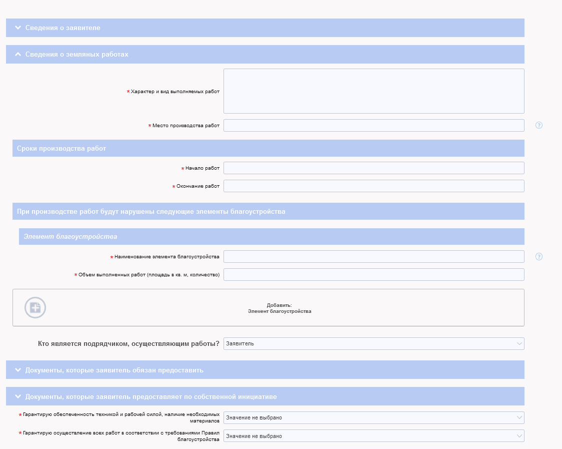 После нажатия кнопки «Далее» откроется форма для заполнения разделов данных: «Сведения о заявителе»,