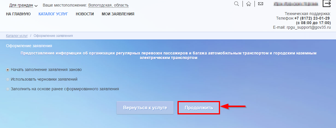 Вы можете создать новое заявление или использовать имеющиеся черновики. Далее нажмите кнопку Продолжить
