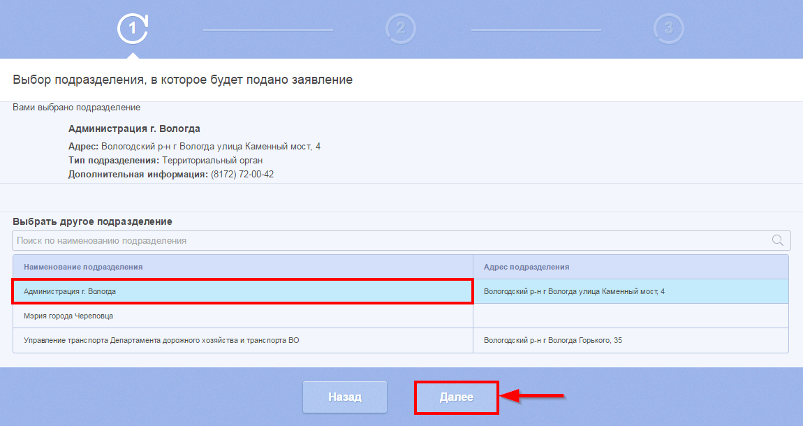 Выберите подразделение, в которое будет подано Ваше заявление, нажав на поле с нужным вариантом в списке. Выбранное Вами подразделение появится над списком подразделений. Затем нажмите кнопку Далее