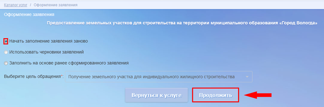 Вы можете создать новое заявление или использовать имеющиеся черновики. Далее нажмите кнопку Продолжить