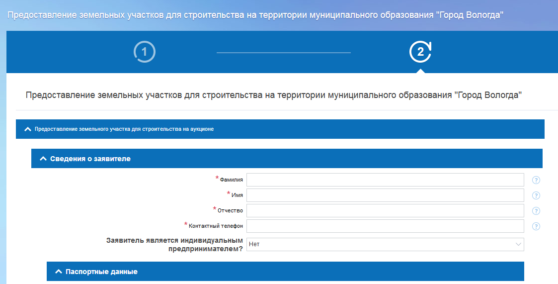 После нажатия кнопки «Далее» откроется форма для заполнения разделов данных:Сведения о заявителе