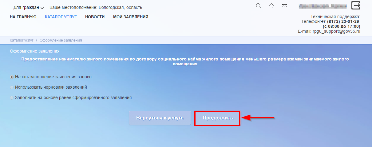 Вы можете создать новое заявление или использовать имеющиеся черновики. Далее нажмите кнопку Продолжить