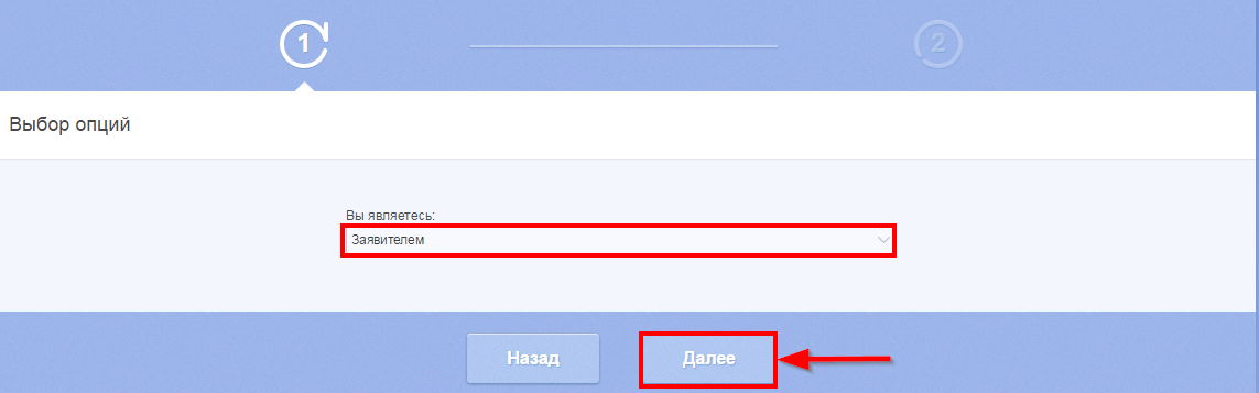 Далее выберите нужные варианты в выпадающих списках для полей: «Вы являетесь». Затем нажмите кнопку «Далее».