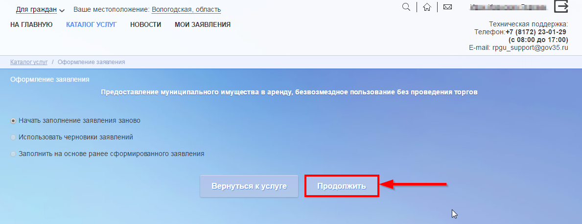 Вы можете создать новое заявление или использовать имеющиеся черновики. Далее нажмите кнопку Продолжить