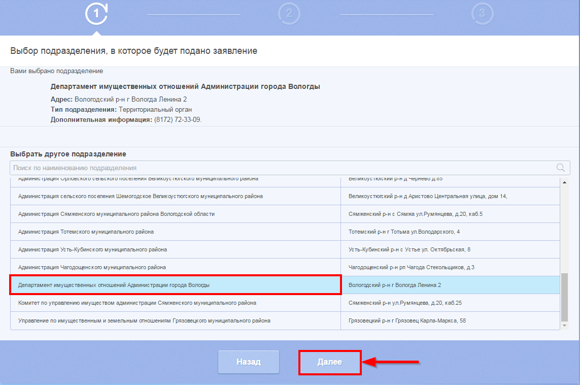 Выберите подразделение, в которое будет подано Ваше заявление, нажав на поле с нужным вариантом в списке. Выбранное Вами подразделение появится над списком подразделений. Затем нажмите кнопку Далее