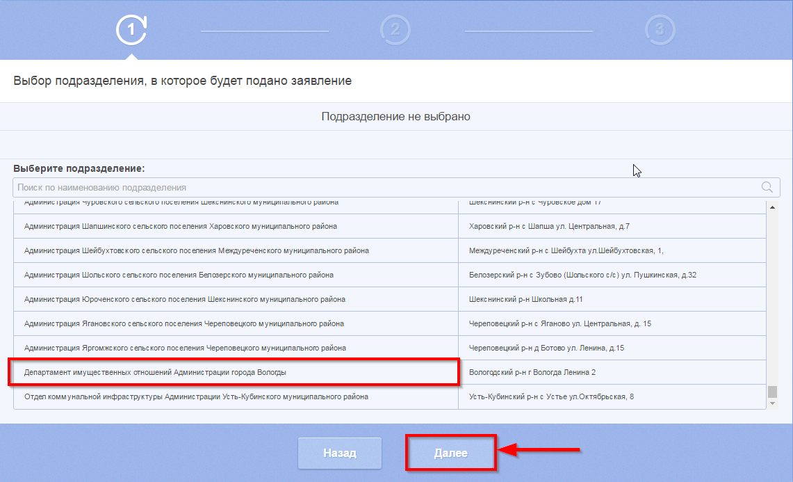 Выберите подразделение, в которое будет подано Ваше заявление, нажав на поле с нужным вариантом в списке. Выбранное Вами подразделение появится над списком подразделений. Затем нажмите кнопку Далее