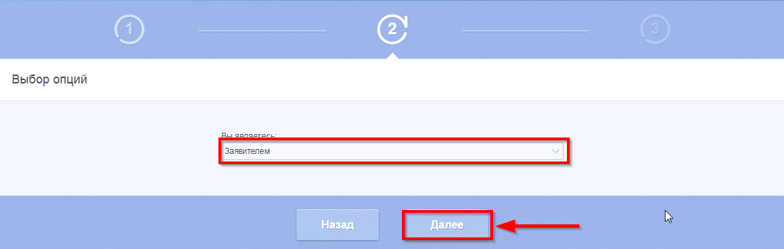 Далее выберите нужный вариант в выпадающем списке для поля: «Вы являетесь». Затем нажмите кнопку «Далее».
