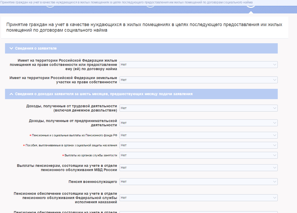 После нажатия кнопки «Далее» откроется форма для заполнения разделов данных: «Сведения о заявителе», «Сведения о доходах заявителя за шесть месяцев, предшествующих месяцу подачи заявления», «Сведения о составе семьи заявителя».