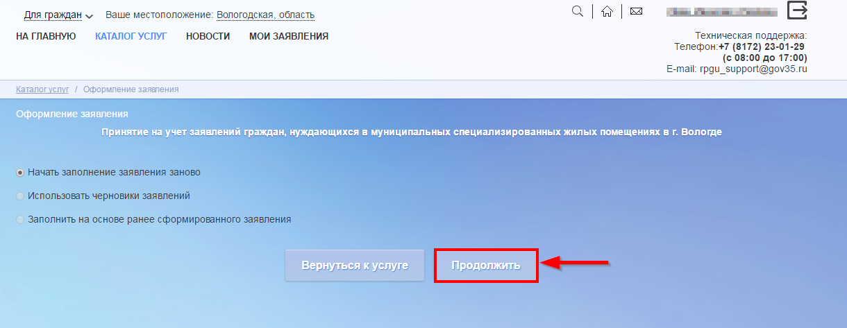 Вы можете создать новое заявление или использовать имеющиеся черновики. Далее нажмите кнопку Продолжить