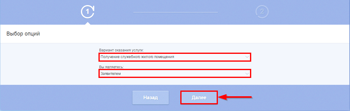 Далее выберите нужные варианты в выпадающих списках для полей: «Вариант оказания услуги», «Вы являетесь». Затем нажмите кнопку «Далее».