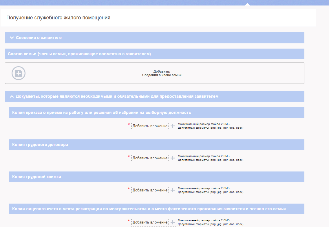После нажатия кнопки «Далее» откроется форма для заполнения разделов данных: «Сведения о заявителе», «Состав семьи (члены семьи, проживающие совместно с заявителем)», «Документы, которые являются необходимыми и обязательными для предоставления заявителем».